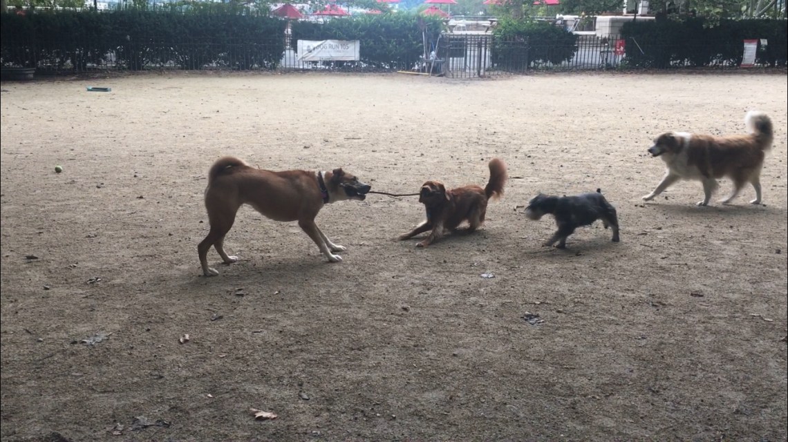 My beautiful baby trying to take a stick from bigger dog… he did it! Mind over matter.