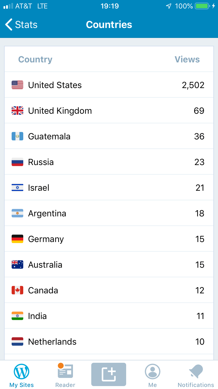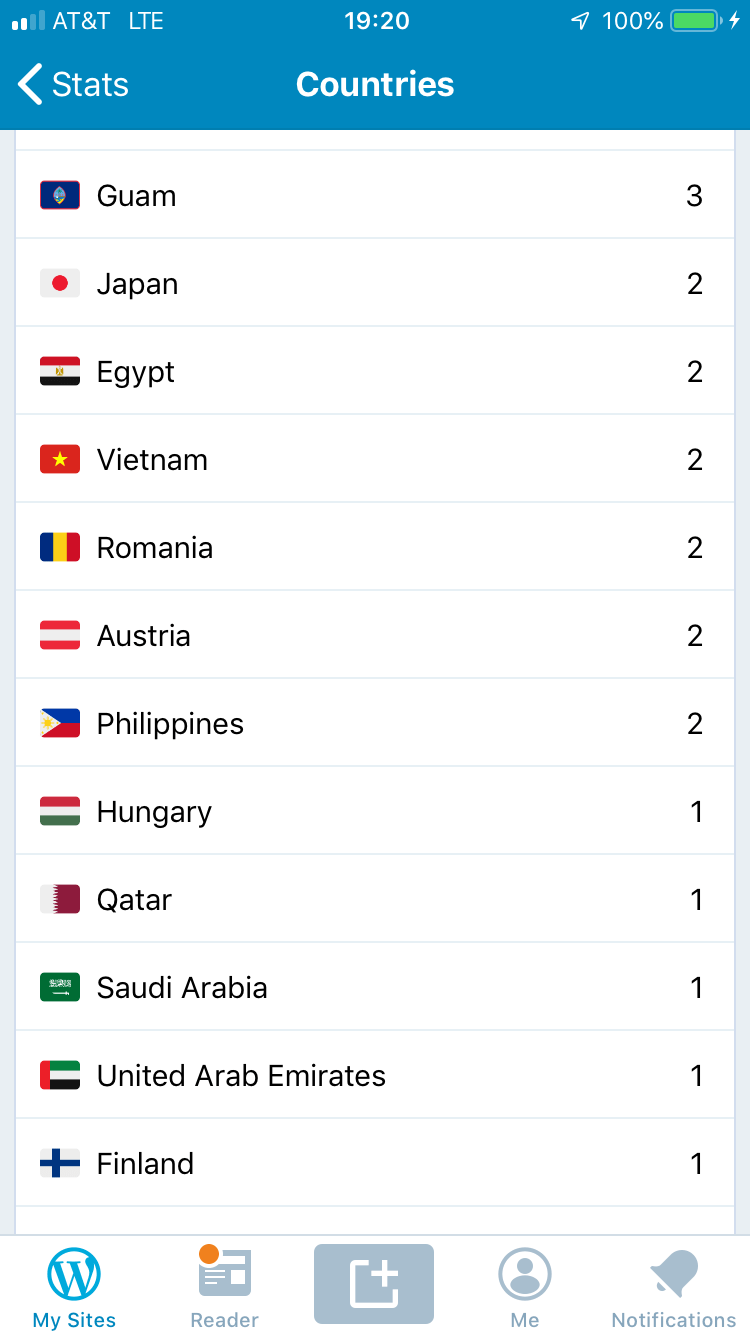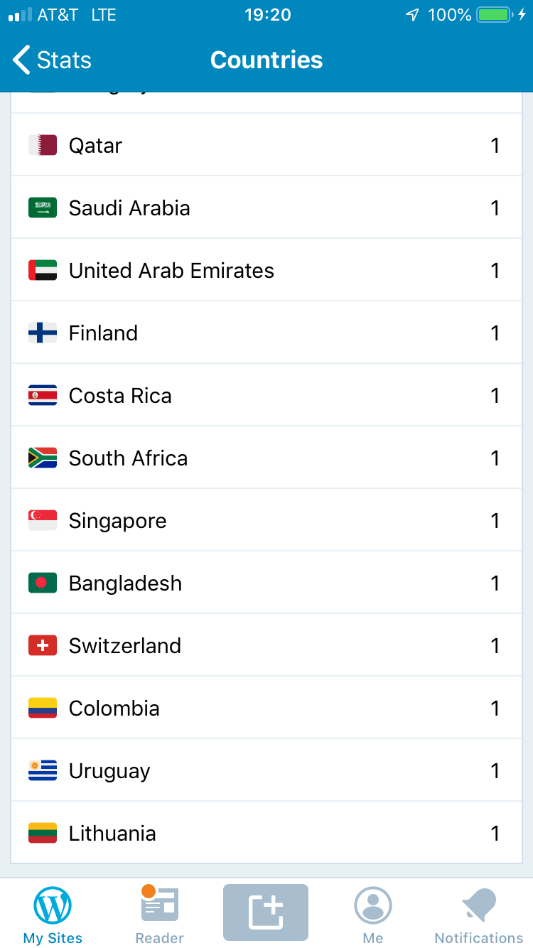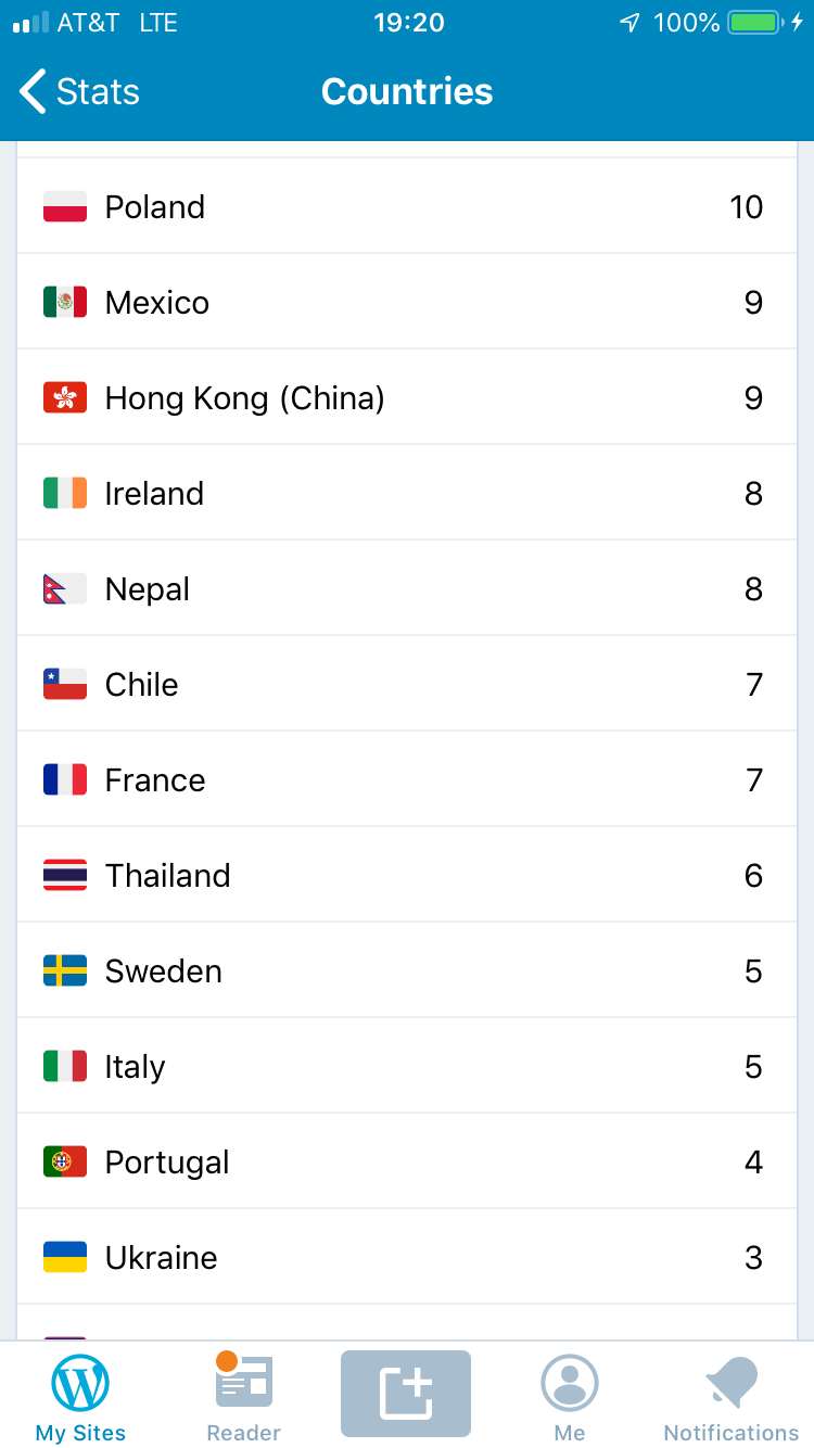 I thought that only a few friends would read my blog. Sometimes it feels like shouting into a void. But at least one person in 46 counties has heard my voice. You can affect more people than you realize! Just remember no one will believe in your dream more than you do, so get out there and go for it!