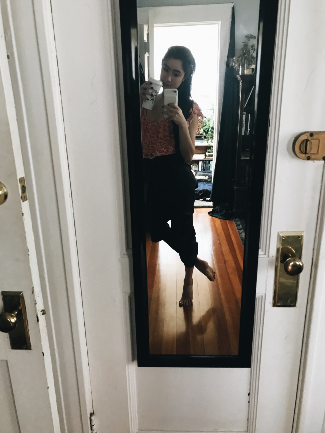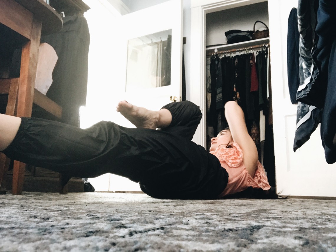 I really should stretch when I get home the night before, but I’m usually too exhausted. Because night usually means 3-5am. I put on my heat trapping dance pants over my pjs to do some core work and get in a stretch.