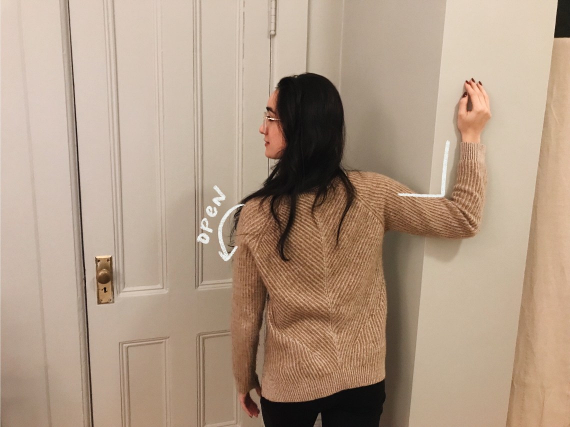 Bring your arm out to the side, perpendicular to your body. Bend 90* at the elbow and place the inner arm on the door frame. The more you turn away from your arm the deeper the stretch.