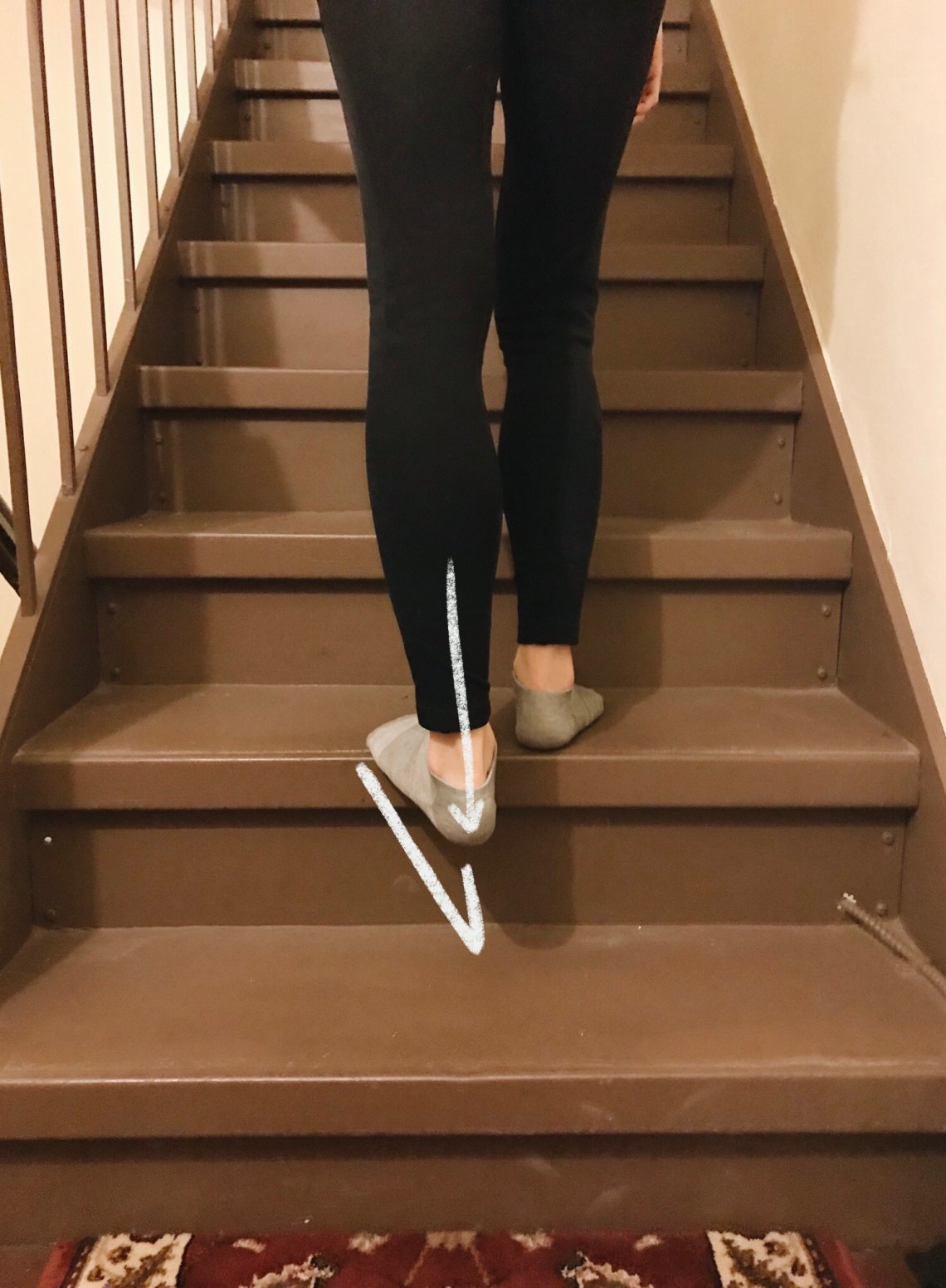 An easy way to stretch the back of the legs is to let your heels hang off of a stair. If it is too much pressure on both legs, try stretching one at a time with this method, keeping some of the body weight in the supporting leg.