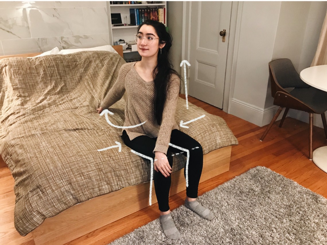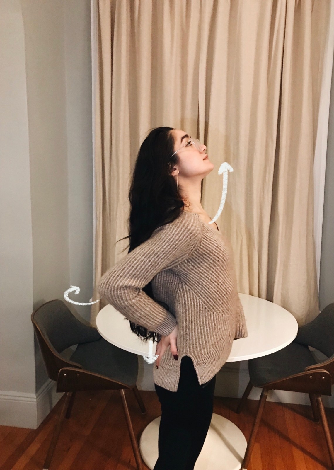 Feet under hips, from a standing posture. With the palms supporting the lower back, finger tips facing downward, bend from the upper back, imagining your heart is lifting up and elbows are coming toward each other.